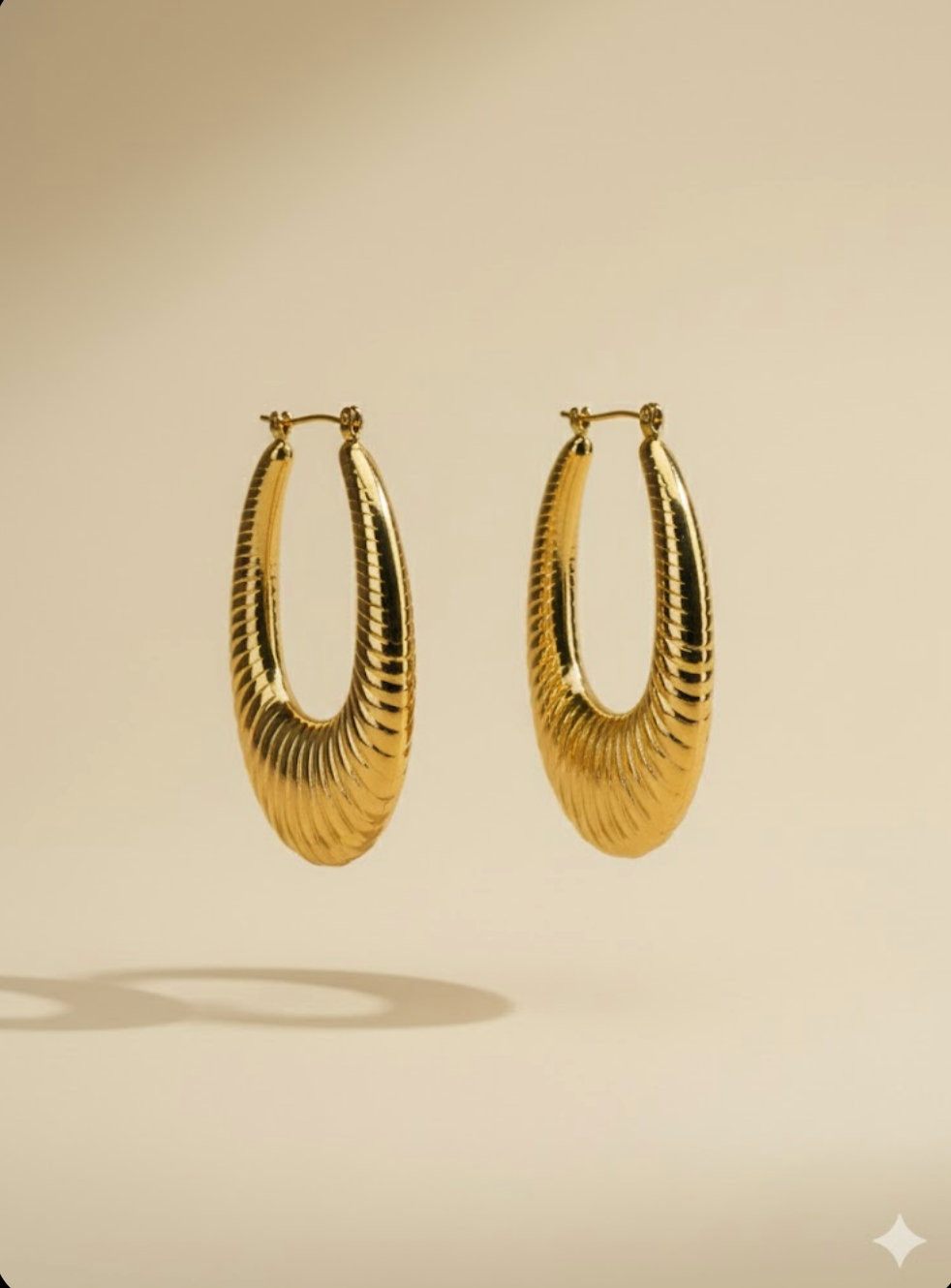 Elongated gold-toned hoops featuring a ribbed, tapered form with a high-polish finish. Crafted in anti-tarnish imitation metal, designed to frame...