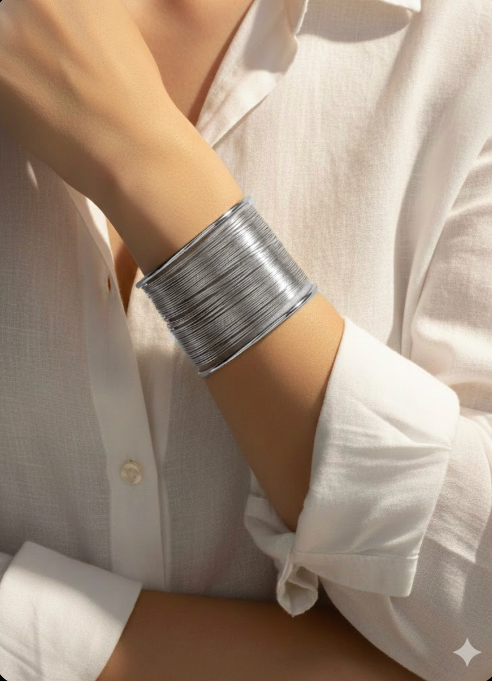 A bold silver-toned cuff crafted with fine layered metal detailing for a sleek, textured finish. Designed in anti-tarnish imitation metal,...